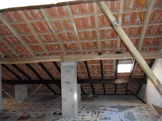 A parede lateral já começou a ser rebocada (a qualidade da imagem não é a melhor...havia muita poeira em suspensão no ar):